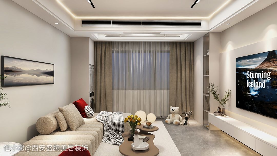 邊框線條:簡潔的乳膠漆做基礎,根擾電視墻的比例造型,裝上邊框線條,保持簡約大方的基礎,還能增加電視墻的層次美與對稱設計感,這也是一種簡約大方的設計方案。
